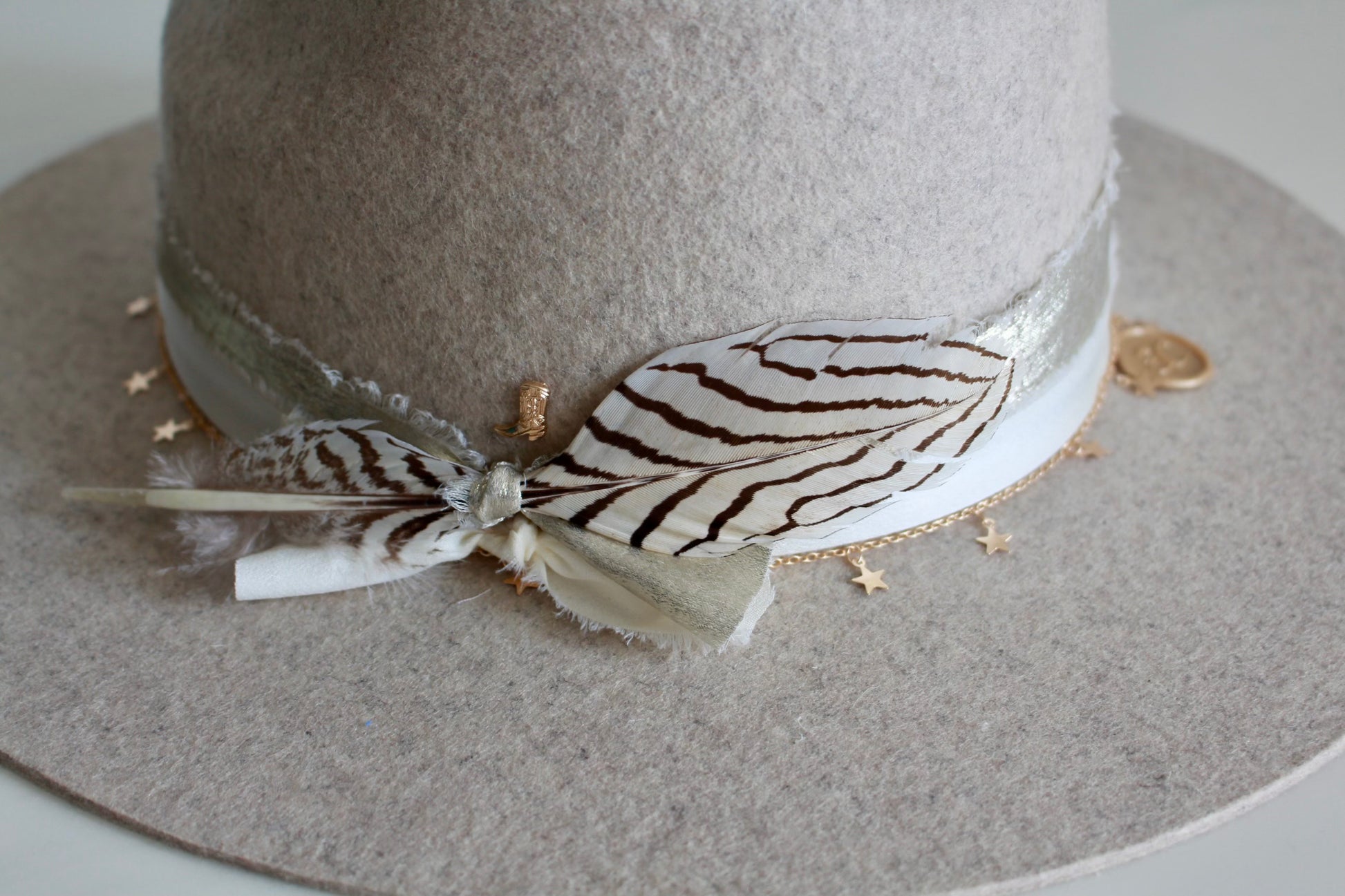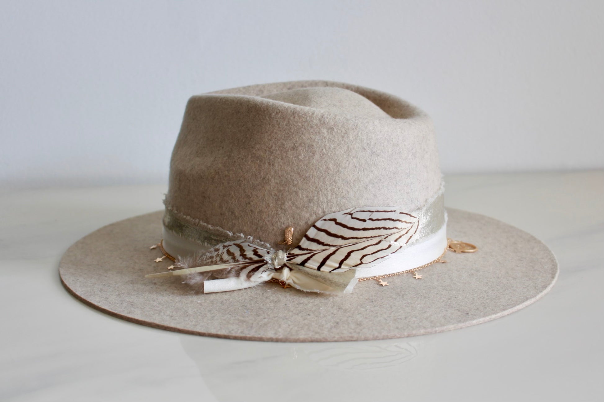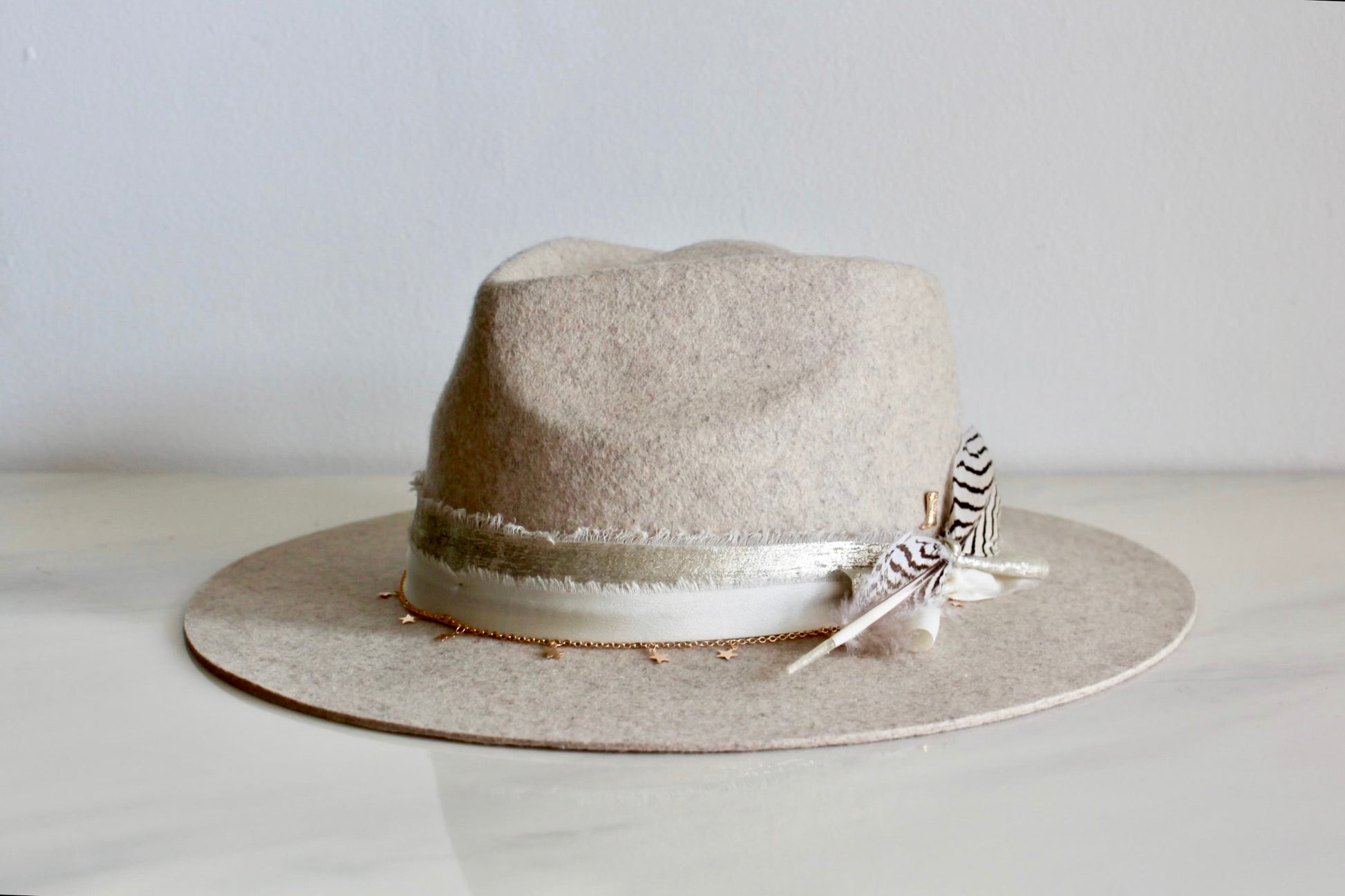 Classic Oatmeal Fedora with a shimmery gold band, layered with a cream chiffon, star chain topped off with a white/brown feather and gold cowboy boot pin.