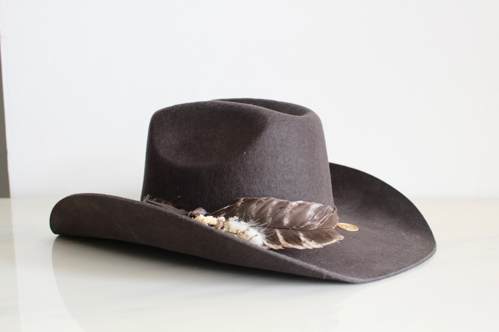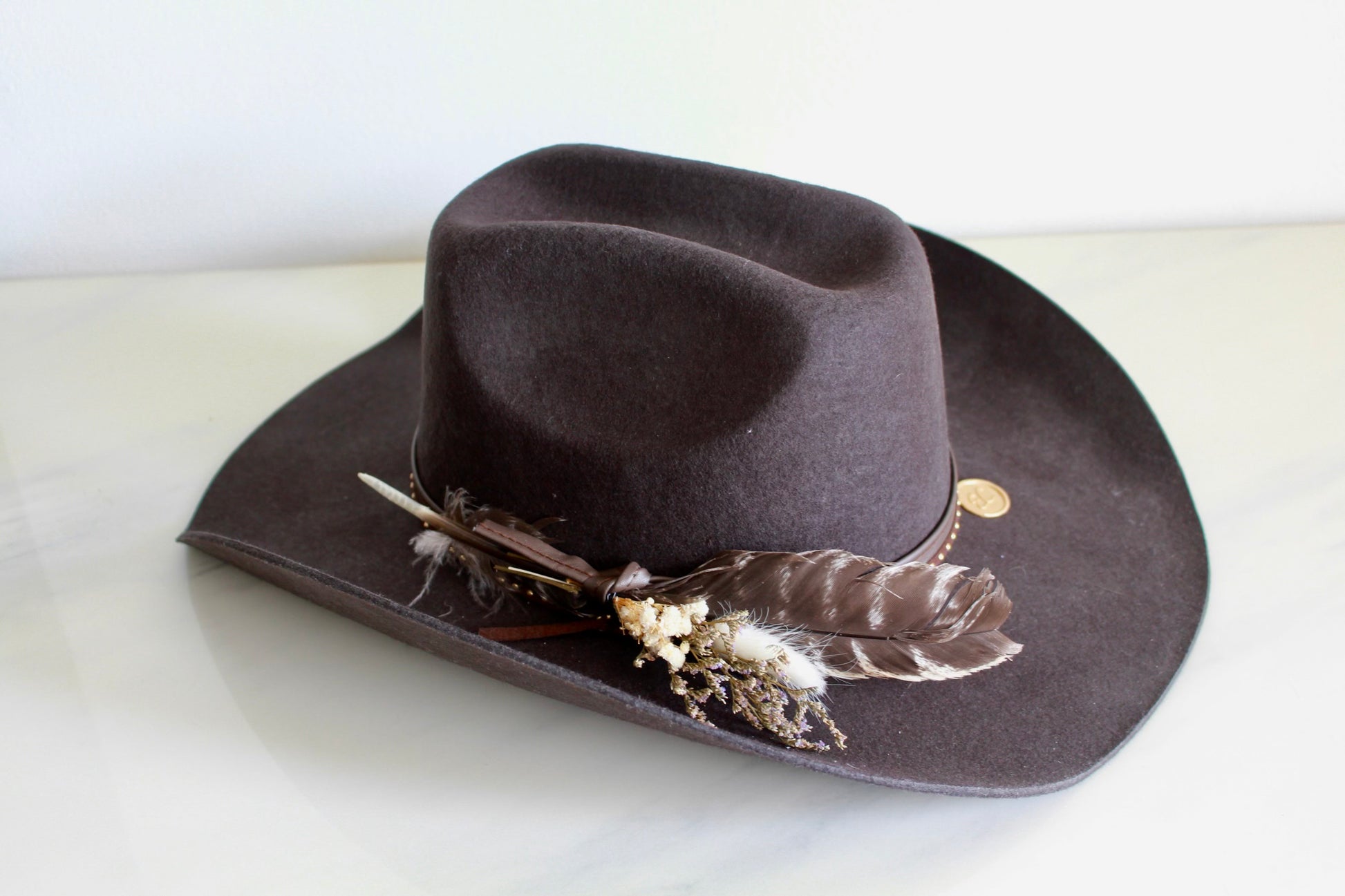 Standard Coffee Cowboy with a coffee leather band, coffee studded cord, a feather and mini floral bouquet.