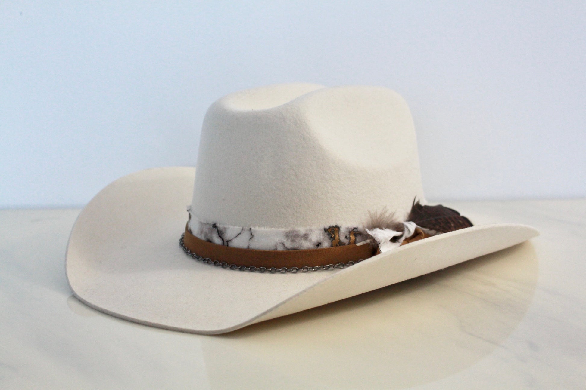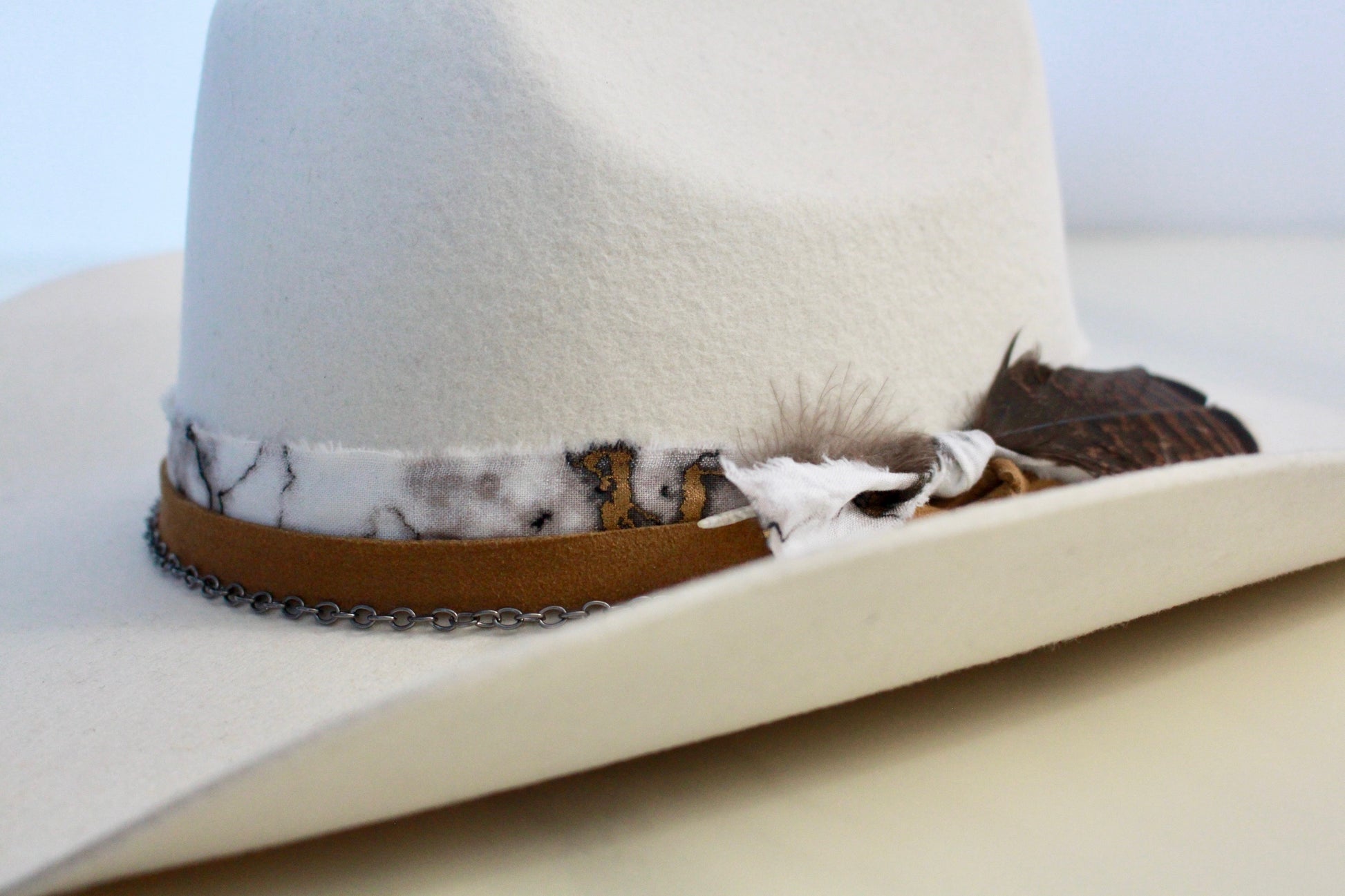 Standard Ivory Cowboy featuring a marble band in gold, black, and ivory, layered with a rich suede cognac band and a sleek gunmetal chain, finished with a feather accent.