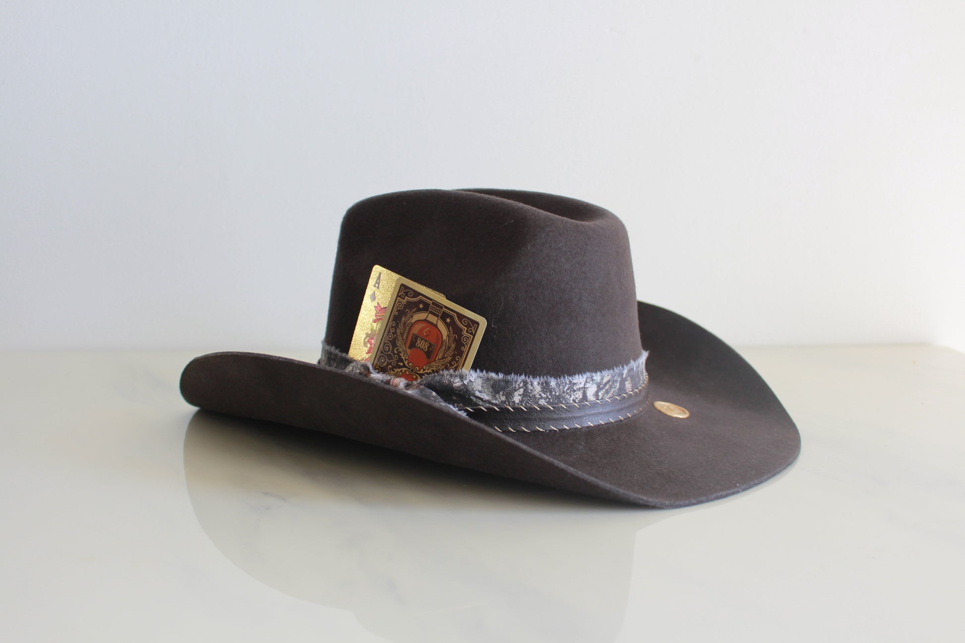 Standard Coffe Cowboy with a camo band layered with a coffee leather band and 2 gold bourbon cards. Please note card number may vary based on availability.